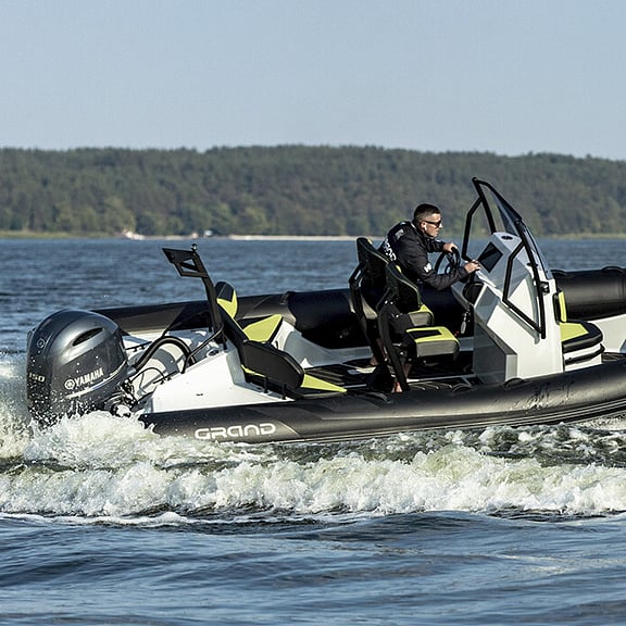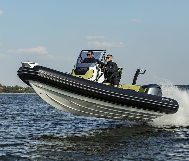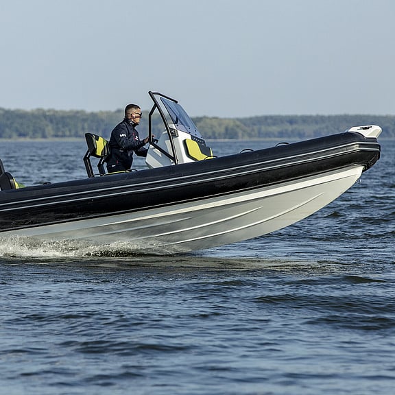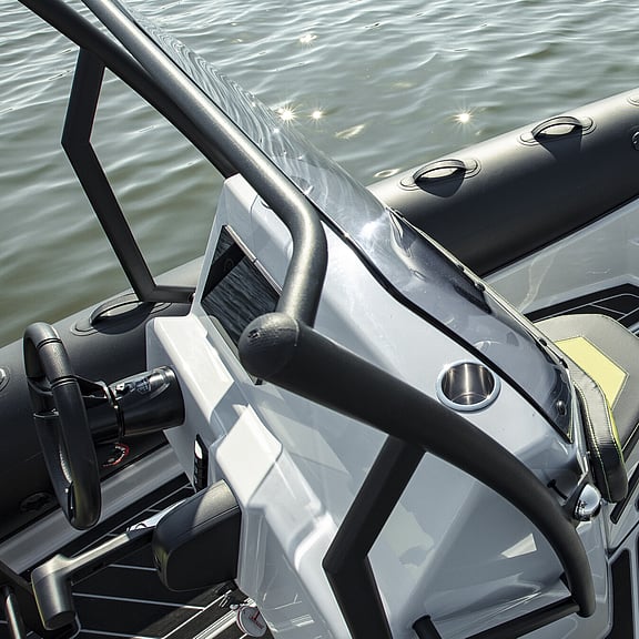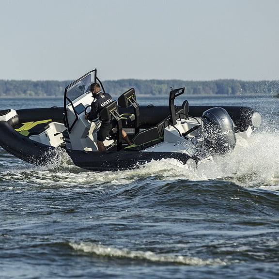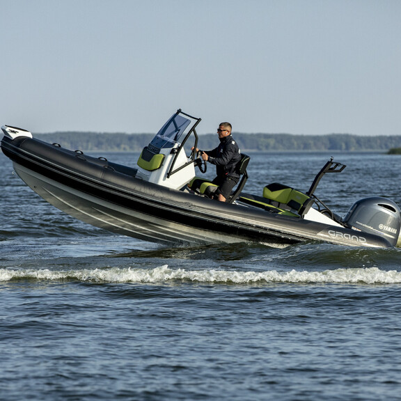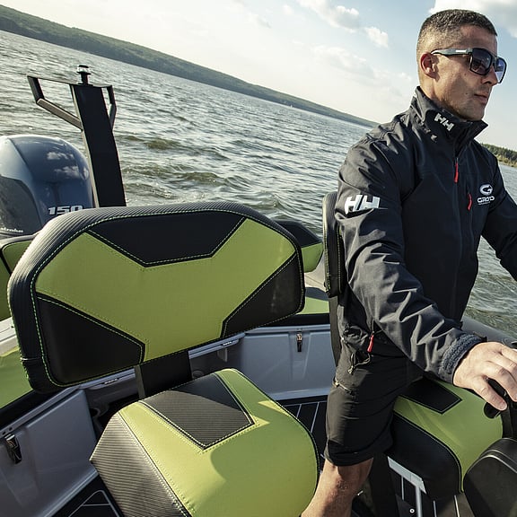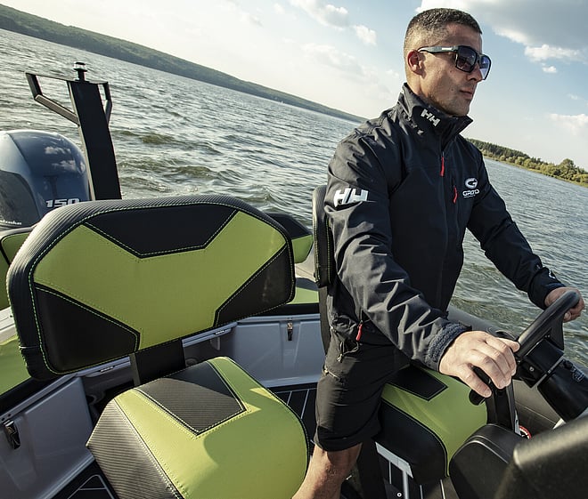 This version puts you in the shoes of a racing pilot. Feel the rush, the wave, the performance and how adrenaline fills your veins. Feel safe and free with big open deck, two adjustable sports seats, console safety railing and dry storage compartments to speed up the blood flow by squeezing the top speed out of 150 HP engine this boat is designed for.